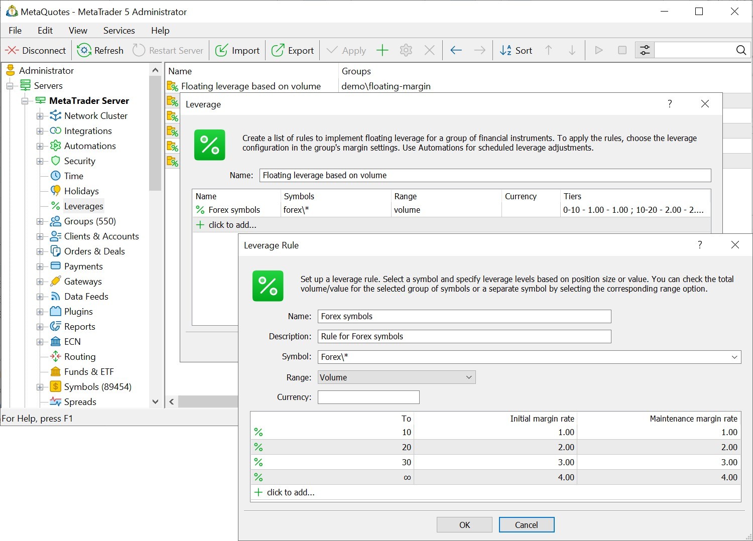 从Build 4150开始,MetaTrader 5在管理员终端中引入了浮动杠杆支持,使经纪人能够根据情况和公司政策调整杠杆设置。使用浮动杠杆,您可以根据未平仓头寸数量灵活调整所需的保证金规模。一方面,这为较小的交易者提供了利用最大杠杆的机会,另一方面,它降低了与大客户打交道时的风险。这一解决方案集成到MetaTrader 5交易平台中,您可以立即开始使用它,而不需要额外的费用。